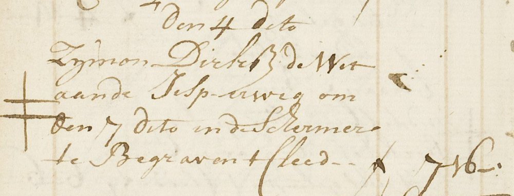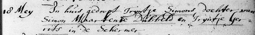 | 4. | v | Trijntje (Trijntje) Simons DUBBELT [3334]. Geb. ±05-1690 te ? (bron: ?), ged. (Remonstrants) op 18-05-1690 te Schermer (bron: DTB Alkmaar inv nr 132), in huis gedoopt Overl. ±04-1728 te ? (bron: ?), - Aangifte op 22-04-1728 door Simon Kaasboer (bron: ?), begr. op 26-04-1728 te Middenbeemster (bron: DTB Beemster inv nr 7). Otr. [3243] ? te ? Tr. ? te ? Tr. kerk ? te ? Echtgenoot is Arien (Arien) Dirksz WIT [10136]. Geb. ? te ? Ged. ? te ? Overl. ? te ? Begr. ? te ? Zn. van Dirk (Dirk) WIT [10137] en ? (?) ? [10138]. |