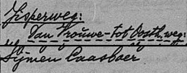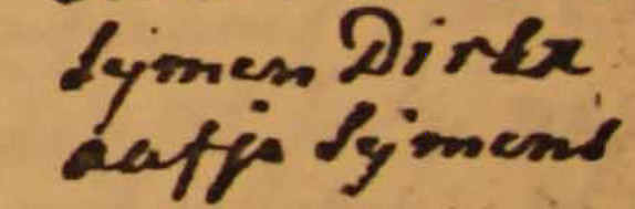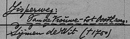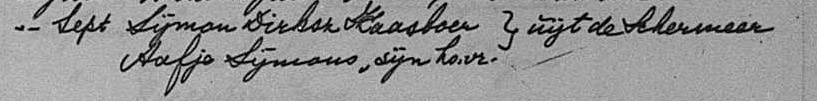 | 3. | v | Aafje (Aafje) Simons DUBBELT [3333]. Geb. ±12-1687 te ? (bron: ?), ged. (Remonstrants) op 28-12-1687 te Alkmaar (bron: DTB Alkmaar inv nr 132). Overl. ±01-1735 te ? (bron: ?), begr. op 29-01-1735 te Schermer (bron: DTB Beemster inv nr 7). Otr. [3242] op 03-03-1709 te Zuid-Schermer (bron: DTB Akersloot inv nr 5). Echtgenoot is Simon (Simon) Dirksz KAASBOER (de Wit) [10133]. Geb. ? te ? Ged. ? te ? Overl. op 04-11-1750 te Beemster (bron: DTB Beemster inv nr 5). Zn. van Dirk (Dirk) KAASBOER [10134] en ? (?) ? [10135]. - Op 23-05-1709 verkoopt ene Simon Dirksz de Wit uit de schermeer voor de schepenen te Oterleek een huis met erf aan Klaas Klaas Hein. (bron: ?) - Op 03-01-1730 wordt Simon Kaasboer genoemd als voogd van Neeltje Sneeboer dochter van Jan Simonsz Sneeboer en wijlen Maartje Cornelis. Dit volgens ORA Beemster inv nr 4083 (bron: ?) - Op 03-03-1734 vermeld in het kohier voor zout zeep heere en redemptiegeld in de laagste van de vier klasse. Dit volgens schepen archief waterland inv nr 1 (bron: ?) - In 06-1742 genoemd in lidmaten register NG gemeente te Beemster als wonende op de Jisperweg. - Op 29-02-1744 genoemd als medeerfgenaam vn zijn zoon Simon (bron: ?) - In 06-1746 genoemd in lidmaten register NG gemeente te Beemster als wonende op de Jisperweg. - Op 23-01-1749 procuratie voor notaris Frederik van der May uit de Beemster. Dit wegens het overlijden van zijn zoon Dirk Simonsz de Wit op het schip Buvegnies van de VOC op de terugreis uit Batavia. - In 06-1750 genoemd in lidmaten register NG gemeente te Beemster als wonende op de Jisperweg. - In 1717 genoemd in lidmaten register NG gemeente Noord-Schermeer. - In 09-1727 genoemd in lidmaten register NG gemeente te Beemster als inkomende uit de Schermeer. - In 06-1732 genoemd in lidmaten register NG gemeente te Beemster als wonende op de Jisperweg. - Op 07-01-1735 wordt door hen een testament opgemaakt (bron: ?). |