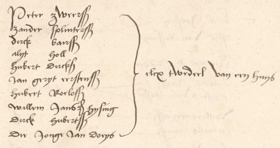 | 4. | m | Johan (Jan) Eerstensz PAUW [29019]. Geb. rond 1457 te ? Ged. ? te ? Overl. ? te ? Begr. ? te ? - Op 22-02-1515 ene Johan Eernst genoemd met naastgelgen land in de pacht van Eernst Willemsz zoon van Willem Eernst en Geertruid van de heren van Oudmunster te Utrecht. (bron: 223 heren Oudmunster inv nr 1347-2/3) - Op 19-02-1522 pachten Steven Hubertsz en Jan Eerstensz een viertel in 1 hoeve in Jutphaas. De broer van Jan Eerstensz, Anthonis Eerstensz zegelt met 3 lelies. Dit volgens 221 Kapitel van Sint Maria inv nr 1310-6 (bron: ? (Utrechtse Parentelen voor 1650 deel 5)) - In 1525 wordt Jan Eerstensz met 7 anderen aangeslagen voor 1 1/2 huis in Jutphaas in het huisgeld register. Dit volgens Staten van Utrecht inf 58-373 (bron: ? (Utrechtse Parentelen voor 1650 deel 5)) - Op 04-01-1531 pacht Jan Eerstensz een viertel in 1 hoeve in Jutphaas. De broer van Jan Eerstensz, Anthonis Eerstensz uit Utrecht zegelt met een pronkende pauw. Dit volgens 221 Kapitel van Sint Maria inv nr 1310-10 (bron: ? (Utrechtse Parentelen voor 1650 deel 5)) - Op 02-10-1532 wordt Jan Eersten vermeld in een lijst van oudschildgeld plichtigen. Dit volgens Staten van Utrecht inf 58-375 (bron: ? (Utrechtse Parentelen voor 1650 deel 5)) - Op 12-10-1532 zien Anthonis Eersten man van Gijsbertje voor zichzelf en Jan Eersten man van Cornelia af van de erfenis van hun broer Gijsbert Eersten. Het huis aan de Springweg dat gijsbert zonder consent van sijn vrouw Willemtje aan de regulieren heeft verkocht wordt ook vermeld. Dit volgens 701-3 Utrecht 704-18 (bron: ? (Utrechtse Parentelen voor 1650 deel 5)) - Op 10-07-1537 overdracht van de erfenis van Anthonis Eersten door zijn broer Jan Eerstensz man van Cornelia te Jutphaas aan de kinderen van broer Willem Eerstensz genaamd Akrijn Willemsz, Hendrik Willemsz, Cornelis Willemsz, Gouda Willemsz, Geertruida Willems vrouw van Goijer Adriaansz lijndraijer en Janna Willemsz vrouw van Cornelis Klaasz [moet zijn Klaas Cornelisz], de kinderen van broer Gerrit Eerstensz genaamd Jacob Gerritsz, Eerst Gerritsz, Cornelis Gerritsz, Jan Gerritsz, Anthonia Gerrits vrouw van Roelof Jansz en Alida Gerrits vrouw van Willem Lambertsz, [dochter van Jan Eersten en Cornela genaamd] Alida Jan Eerstensz vrouw van Dirk Klaasz [smit] en de kinderen van zijn zuster genaamd Jan die Cruijff, Heijlwich de Cruijff, Maria de Cruijff en Sophia [de Cruijff] vrouw van Tyman de Geer/ der aan Peter van Dael brouwer te Utrecht. Antonius Eersten is haar oom. (bron: 701-3 Hof Utrecht 704-23 fol 113) - Op 21-04-1540 pacht hij het onderste viertel van een hoeve in het nederend van Jutphaas. Dit volgens 221 Kapittel Sint Marie inv nr 1310-15 (bron: ? (Utrechtse Parentelen voor 1600 deel 5)) - Op 23-01-1543 boedelscheiding van de erfgenamen van Anthonis Eerstensz en Gijsbertje Jans Hendriksz. Als erfgenamen van Antonis Eersten worden o.a. genoemd, Jan Eersten man van Cornelia te Jutphaas. (bron: 701-3 Utrecht 704-29) Otr. [8725] ? te ? Tr. ? te ? Tr. kerk ? te ? Echtgenote is Cornelia (Cornelia) ? [29029]. Geb. ? te ? Ged. ? te ? Overl. ? te ? Begr. ? te ? Dr. van ? (?) ? [29030] en ? (?) ? [29031]. - Op 08-02-1537 overdracht van de erfenis binnen Utrecht van Antonius Eersten door o.a. namens Alida [Jans Eerstens] diens man Dirk Klaasz smid. Antonius Eersten [man van Geertruida Jans Hendriks] is haar oom. Dit volgens 701-3 Utrecht 704-23 (bron: ? (Utrechtse Parentelen voor 1650 deel 5)). |