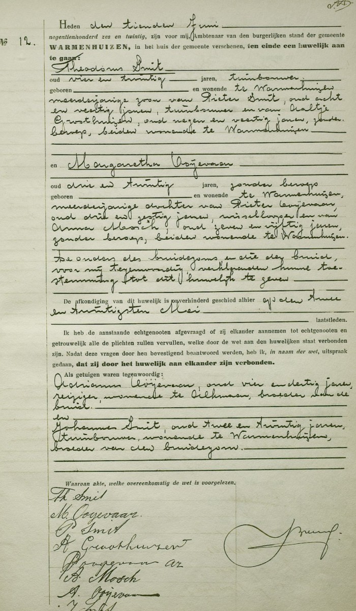 | 2. | m | Petrus Adrianus (Petrus Adrianus) SMIT [1399] , scheepsbouwer, hoofd technische dienst, technicus boorplatform. Geb. op 29-04-1928 te Warmenhuizen (bron: ?), ged. ? te ? Overl. op 21-07-2011 te Warmenhuizen op 83-jarige leeftijd (bron: ?), begr. op 26-07-2011 te Warmenhuizen (bron: ?). Otr. [277] ? te ? Tr. op 25-jarige leeftijd op 19-11-1953 te Warmenhuizen (bron: ?), tr. kerk op 19-11-1953 te Warmenhuizen (RK) (bron: ?). Echtgenote is Catharina Adriana (Trien) HOOGEBOOM [1407], 25 jaar oud. Geb. op 21-04-1928 te Warmenhuizen, ged. ? te ? Overl. op 23-08-2019 te Warmenhuizen op 91-jarige leeftijd (bron: ?), begr. op 27-08-2019 te Warmenhuizen (bron: ?). Dr. van Martinus (Tien) HOOGEBOOM [1408] en Catharina (Trien) VLUGT [1409].